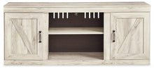 Express your farmhouse style with this entertainment center. Its wispy white finish over replicated oak wood grain is a delightful change from the ordinary. Clean-lined, classic styling with barn door inspiration provides a country chic aesthetic that’s a breath of fresh air. Its combination of cabinet storage and open display space with LED lighting makes for just the right mix. What really turns up the heat: an electric infrared fireplace insert with faux firebrick surround that operates with or without infrared heat and includes a multi flame feature, 7-level temperature setting, five brightness levels and LED glowing embers effect.
