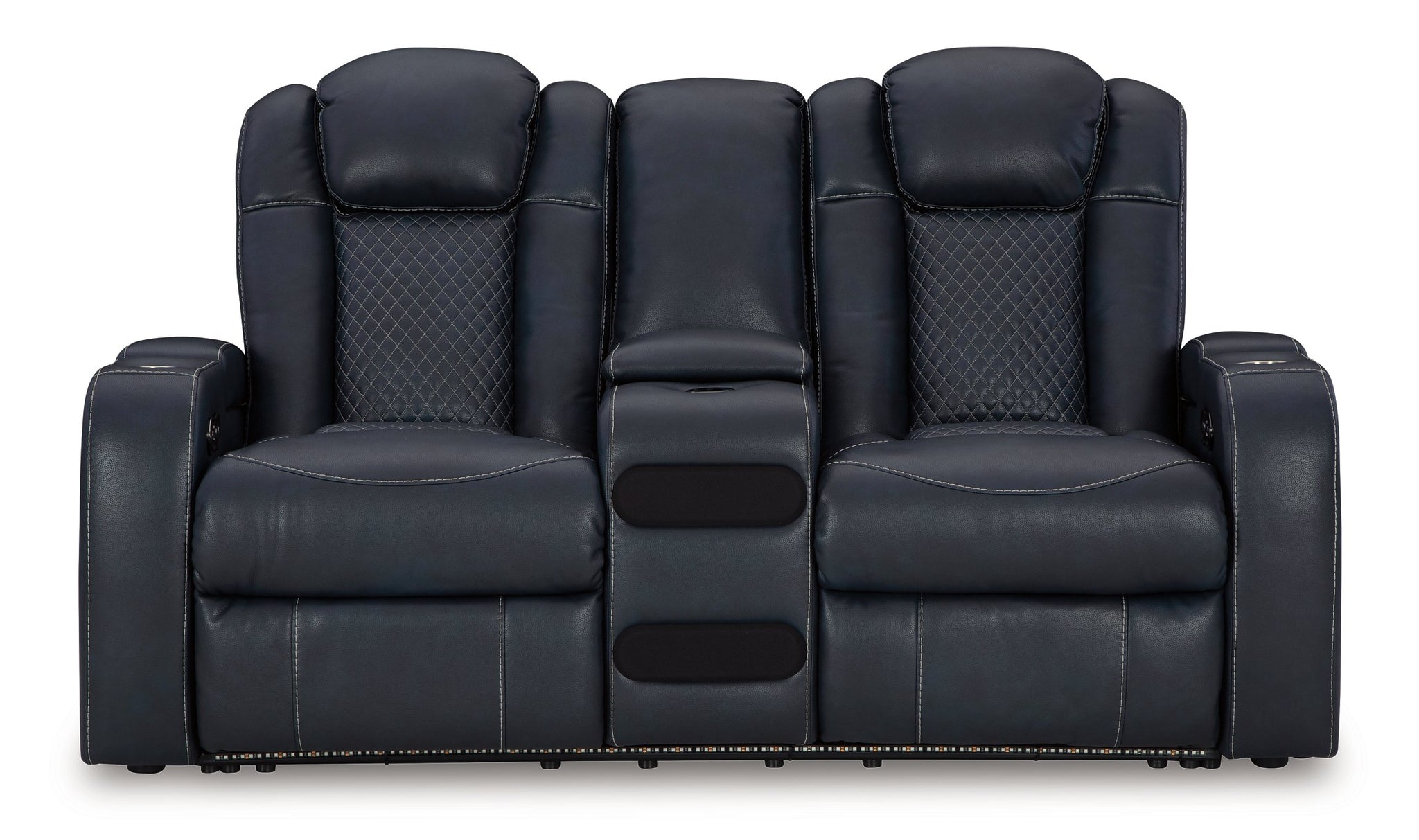 This power reclining loveseat goes beyond basic comfort. It upgrades the everyday, turning your living room into an entertainment hub. Don’t want to leave your seat? Keep essentials in reach with cup holders and storage arms. You can create an even cooler vibe for family movie nights and friendly gaming matches with LED lights. Immerse yourself further with built-in wireless audio connectivity. And your sleek style isn’t compromised—its diamond stitching and streamlined arms recall the aesthetics of luxury automobiles.
