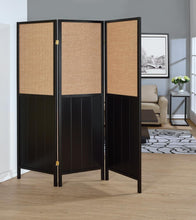 A minimalistic design, this three-panel folding screen offers functionality without an overbearing design. The wood on the panels are finished in a rich black. Each panel comes with a cutout filled with a tan woven fabric, contrasting the overall design nicely.