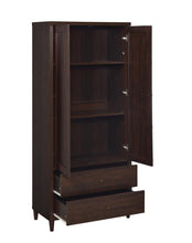 This tall, gorgeous accent cabinet offers plenty of storage options in a rustic, tobacco engineered veneer. Two drawers and an inner shelf provide ample storage space, bringing functionality to this decorative accent piece. Accenting the rustic tobacco finish is simple hardware elements finished in brass. A clean, sturdy piece, this cabinet can be a great addition to your home.