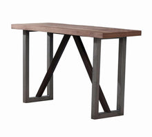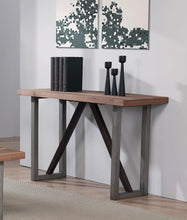 Display your favorite decorations in style with this sofa table that combines industrial and natural influences. The square frame legs feature a metallic finish, standing in striking contrast to the natural walnut tones of the wood tabletop. Use the narrow profile of this piece to your advantage – not only is this a great piece for the living room, but it can also fit well within small spaces like hallways.