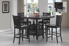 This simple and stylish counter-height square dining table can be the sleek dining room addition you've been looking for. Break away from a traditional style with a table that truly "elevates" your dining experience. Finished in rich espresso and defined by clean lines, this table goes the extra mile with a center storage cabinet and wine glass holders on the underside of the table top.