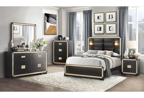 Blake Black-Gold Bed With Lamps-Dresser-Mirror And Nightstand