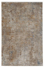 This area rug is a stellar study in color, movement and texture. Featuring a watercolor abstract effect in shades of cream, orange, brown, gray and blue, this vibrant rug makes a statement wherever it is displayed.