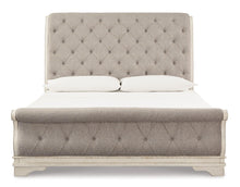 Elevating the art of traditional cottage styling, this California king upholstered sleigh bed is your dream bedroom retreat realized. A curvaceous beauty, this brilliant upholstered bed wows with a distressed chipped white finish for heirloom appeal. Deep tufting on the cushioned upholstered headboard and footboard adds such a cozy element sure to put you at ease. Mattress and foundation/box spring available, sold separately.