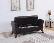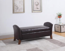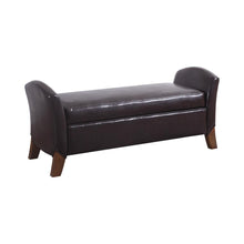 This chic bench is upholstered in a dark brown faux leather that compliments its legs espresso finish. Beautiful lines are created by the splayed legs that meet at the bench's curved arms. With ample storage under the seat, this bench is great in an entryway or bedroom.