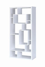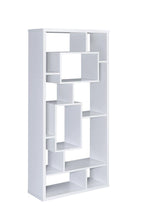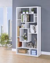 Accommodate your books and decorations of all shapes and sizes on this modern white bookcase. Available in a white finish, this bookcase features ten shelves with an asymmetrical design and interior cube shapes. Start the conversation any room with this bold bookcase.