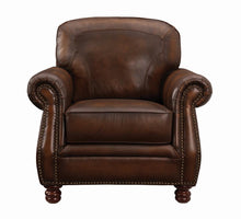 Seeking to bring a rich, classic aesthetic into your traditionally-styled living room or sitting area? Look no further than this beautifully-crafted armchair made of 100% leather with hand rubbed surfaces. This armchair's exterior gives it a truly original look with depth and dimension. Nailhead trim borders the armchair's picture frame back cushions. Turned, solid wood legs in hand rubbed red brown support the piece.