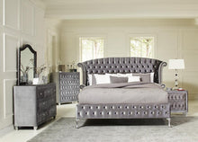 This California king bed from the Deanna Collection takes style inspiration across eras for a sense of timeless luxury. Rolled arms and deep tufting cut a classic profile, while metallic grey upholstery stands out with sharp modern appeal. Opalescent buttons contribute a dash of glam – making this bed a standout piece for personal expression through décor.