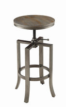 Strong confident lines add character to this industrial bar stool. Constructed from a metal base finished in a slate grey, this stool has a seat top with a wire brushed nutmeg wood finish. A corkscrew adjustable seat ensures you have the perfect seat at the bar.