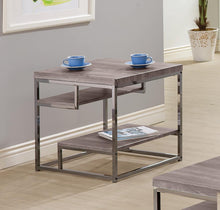 This futuristic design is positively "cool." Bring a modern and unique quality to your living room with this end table, featuring a grey weathered bark-like top paired with a black nickel base. Play around with the three whole levels of storage this end table provides. Bring new levels to your home decor with this end table.