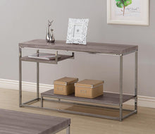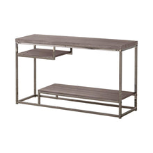 This futuristic design is positively "cool." Bring a modern and unique quality to your living room with this sofa table, featuring a grey weathered bark-like top paired with a black nickel base. Play around with the three whole levels of storage this end table provides. Bring new levels to your home decor with this sofa table.