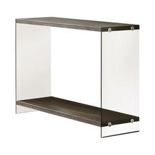 Rustic and modern home decorators rejoice! This sleek sofa table is aesthetically pleasing to any eye, particularly the eye of those who love different styles of furniture and prefer to mix and match. This sofa table will look right at home in houses of any style, with tempered glass sides and weathered grey surfaces. It is the perfect piece of furniture to showcase cherished sculpture, art, or books