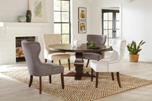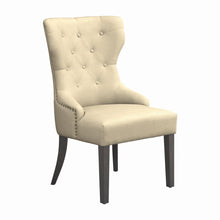 Modern shaped elegantly upholstered beige side chairs with demi-arms are tufted with individually hand applied nail head trim.