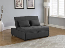 Sleeper sofa bed upholstered in grey linen-like fabric, Tufted seat and back, Easy-to-use pull-out sleeper mechanism, Two accent pillows included, Kiln-dried hardwood frame, Durable sinuous spring decking with high resilience foam seat