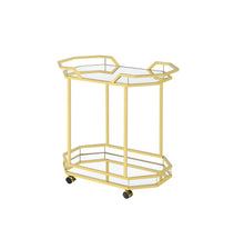 Serve up some great drinks for your guests on this rolling Traditional Brass Serving Cart. Constructed from steel and glass, this serving cart comes in a brass finish. This cart includes two tiers of shelving with guardrails and casters to move happy hour to wherever you need it!