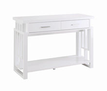 A glossy white finish and decorative shapes ensure this playful sofa table will brighten any interior. Display your favorite decorations on the top and bottom shelves, and store away extra accessories within the two convenient drawers. This lighthearted piece is perfect for the living room, but its narrow profile makes it a good candidate for smaller spaces like bathrooms and hallways as well.