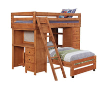 The Wrangle Hill Twin-over-Full Loft Bed with Desk is solidly constructed of durable pine with a built-in ladder and full-length guard rails for safety. The set also features a built in desk, five-drawer chest, and bookcase, all finished in a beautiful amber wash. Maximize your space with this hard-working set.