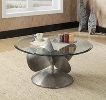 Spark conversation and turn heads with this fabulously quirky coffee table. The propeller-shaped base will capture immediate attention from guests, sure to delight fans of vintage design and found object art. The thick tempered glass top features a stylish beveled edge for decorative appeal while still allowing the propeller to take center stage.