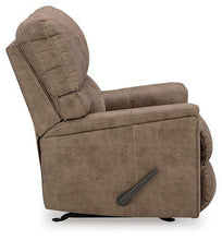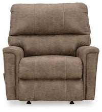 If you love the cool look of leather but long for the warm feel of fabric, you can take comfort in this rocker recliner. Wrapped in a fabulous faux leather with a weathered hue and hint of pebbly texture to resemble the real deal, this decidedly modern recliner proves less is more. Elements include angled side profiling and track armrests wrapped with a layer of pillowy softness for that little something extra. Prominent jumbo stitching and clean-lined divided back styling lend fashion-forward flair.