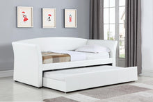 Bring a touch of class to your bedroom with this transitional styled daybed. Fully upholstered in a crisp white faux leather, this bed is sleek and stunning. The arms curve outward at a smooth angle, creating a bold and fun design. The back frame is well-placed and comfortable for use as a sofa. A pull-out trundle provides a second bed.