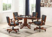 Classy is the only way to describe this black faux leather game chair. This design truly mastered the classic look of a formal game room with the rich, chestnut finish used on the exposed wood arms, back and base. The thick wood is lightly decorated with a ribbed design. Four casters make this chair easy to move.