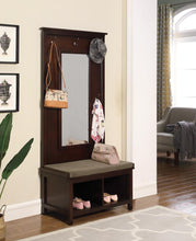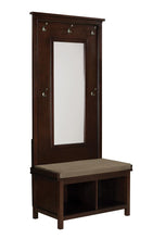 This beautiful hall tree is transitionally-style and finished in raw umber. Featuring hooks, a mirror, and an upholstered seat cushion, this is a piece that offers an impressive range of utility. This piece also features two storage units at its base. You'll love using this hall tree day-in and day-out!