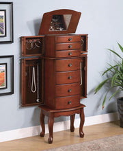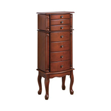 Sporting a rich warm brown finish, this jewelry armoire has plenty of storage and features packed into a small design. With seven felt-lined drawers and two felt-lined doors, this armoire offers plenty of space to store your jewelry and keep it safe. The top has a flip-up mirror to accommodate those last-minute glances in the mirror. Antique brass hardware accents add even more elegance and design to the piece.