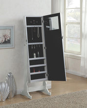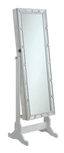 This cheval mirror showcases traditional styling along with classic design elements. The full-length mirror has an ornate border, featuring a silver pattern in metal over an antiqued mirror. The adjustable swivel base allows you to position the mirror to your preferred angle. Open the front of the mirror to reveal a large jewelry storage area. Complete with shelves and hooks, this armoire is perfect for hanging necklaces and bracelets. A bold, black felt lines both sides of the jeweler armoire.