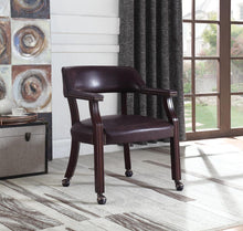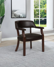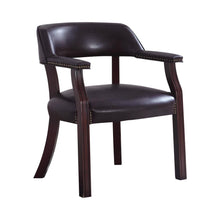 Does your home or commercial office need new seating for guests and clients? Stylish rows of nailhead trim give this modern office chair a touch of vintage charm. Faux leather upholstery in rich brown pairs well with the cappuccino-finished wood for a versatile look that will fit well within a variety of décor themes.