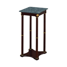 The perfect accent for a traditional room. This plant stand is small in size but can make a big statement. The top features green marble while the base is in a merlot finish. An ornate medallion on the table's front edge adds a classic touch to complete the design.