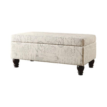 Bonjour! Bring the quaint Provençal life into your home with this transitional-style storage bench. This bench is upholstered in an oatmeal color linen with a French script print. Don't mistake its beauty for its durability; this piece will provide extra storage in any room you may need, from the kitchen to the living room. Keep your items organized while providing extra seating for your loved ones.