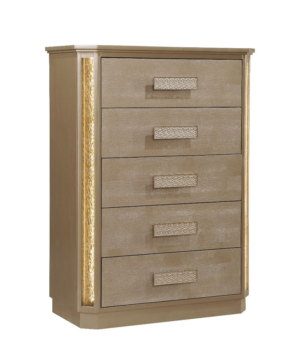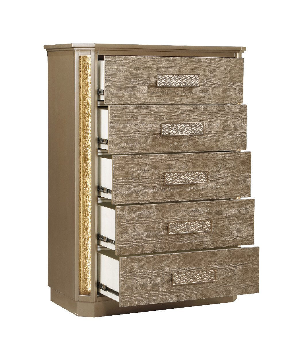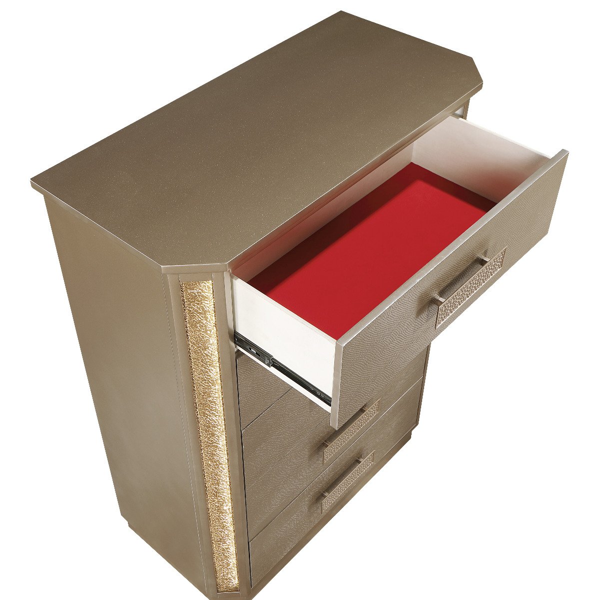 The 5-Drawer Chest is the epitome of style and organization. Its five spacious drawers provide a well-organized storage solution, and the LED Light Accent enhances its charm. This chest features a dazzling gold and copper finish with a distinctive snake skin finish, making it a standout piece in your bedroom. • Five spacious drawers for organized storage. • Elegantly adorned with LED Light Accent. • Dazzling gold and copper finish with a snake skin finish. • Durable and reliable manufactured wood construction.