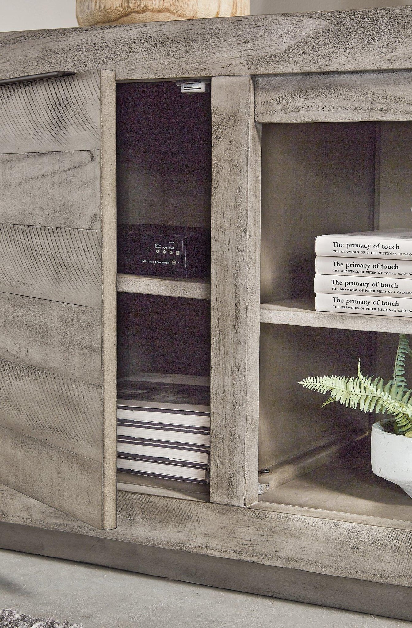 Balancing chic flair with a relaxed sensibility, this extra-large TV stand strikes just the right tone for rustic sophistication. Its beautifully clean lines are subtly enhanced with relaxed distressing and saw marks for authentic barn wood character. For your added viewing pleasure, the wide fireplace insert gives you the cozy feel of a fireplace without the added hassle. With the touch of a button, adjust the temperature and the color-changing flames, and set the timer for long-lasting enjoyment. It comes with faux glass crystals and natural stones, so you can customize the look of the flame bed.