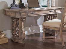 An ornate piece, this beautiful wooden writing desk featuring intricate carvings brings a traditional style to your home. A complex, antique linen finish with hand-brushed details covers the piece, adding to the elegance and beauty. The desk features one felt-lined center drawer for storage, accented in beautiful antique brass hardware.
