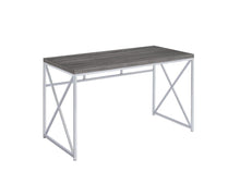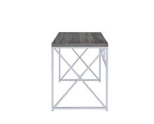 This desk combines sleek lines, bright chrome accents, and weathered grey finish for a transitional look that complements a variety of styles. With its smaller dimensions, this desk fits beautifully in a studio apartment, bedroom, or may be incorporated into large open-concept living area. Blending the rustic look of aged wood and contemporary shine of chrome, this desk delivers both style and function to suit any office.