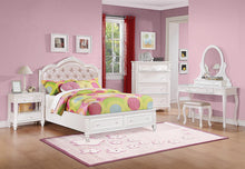 Precious details surround her in this pink and white bed from the Caroline Collection. Rhinestone buttons, rosettes, and an upholstered headboard tufted with rhinestone buttons will have her feeling like royalty. This bed features two storage drawers and is constructed for strength and durability from solid poplar. Also available in twin size and metallic lilac finish.